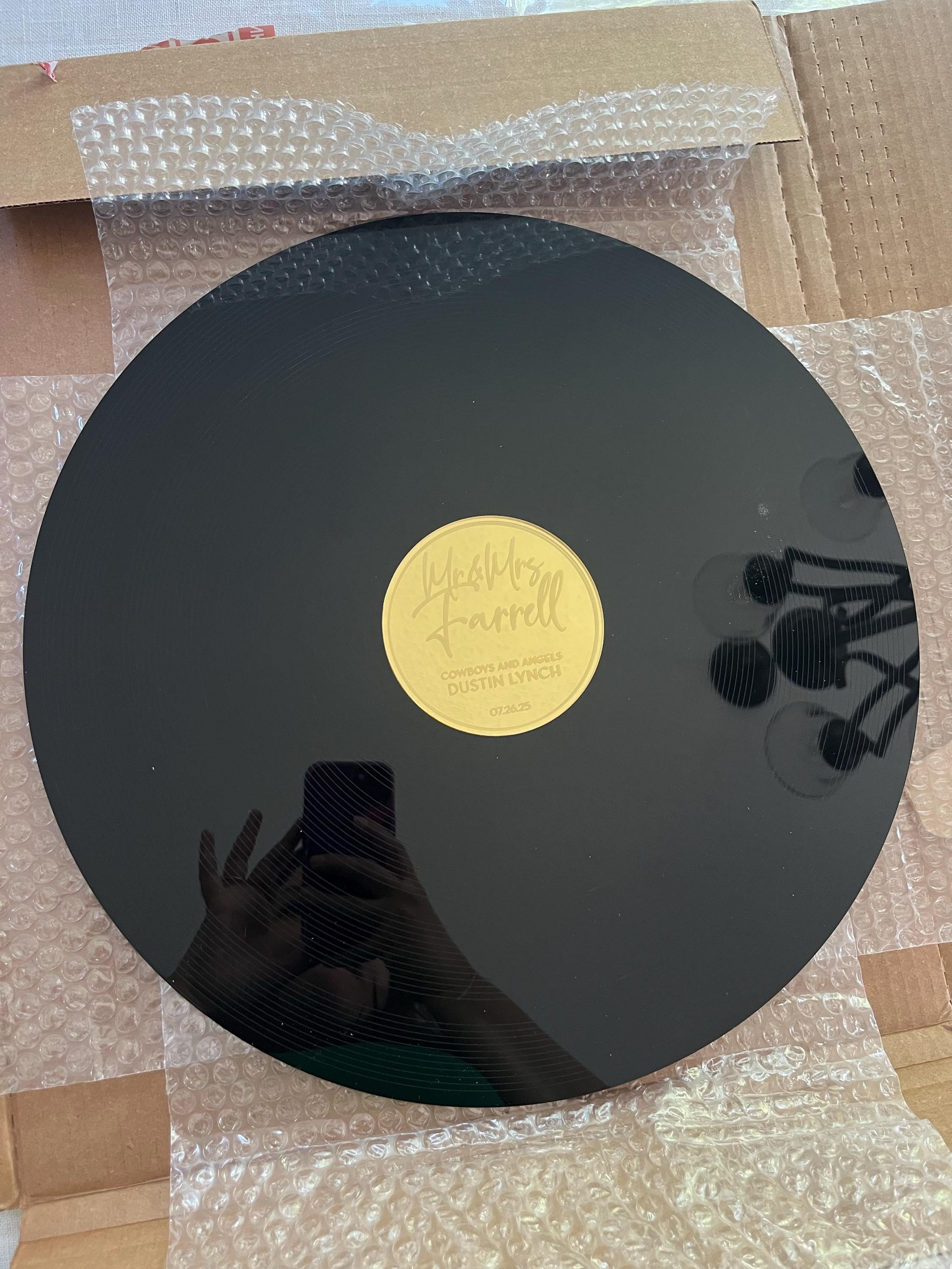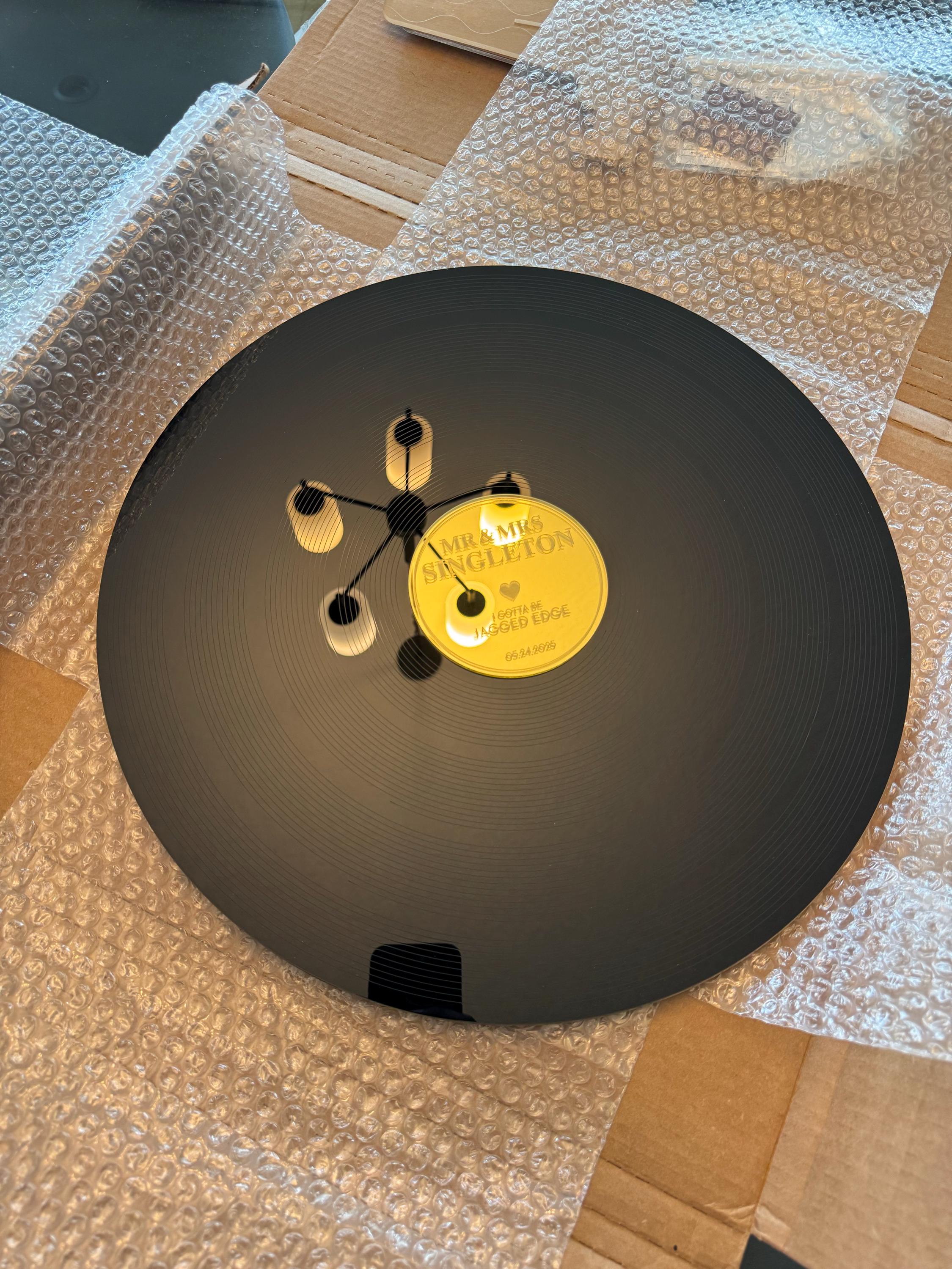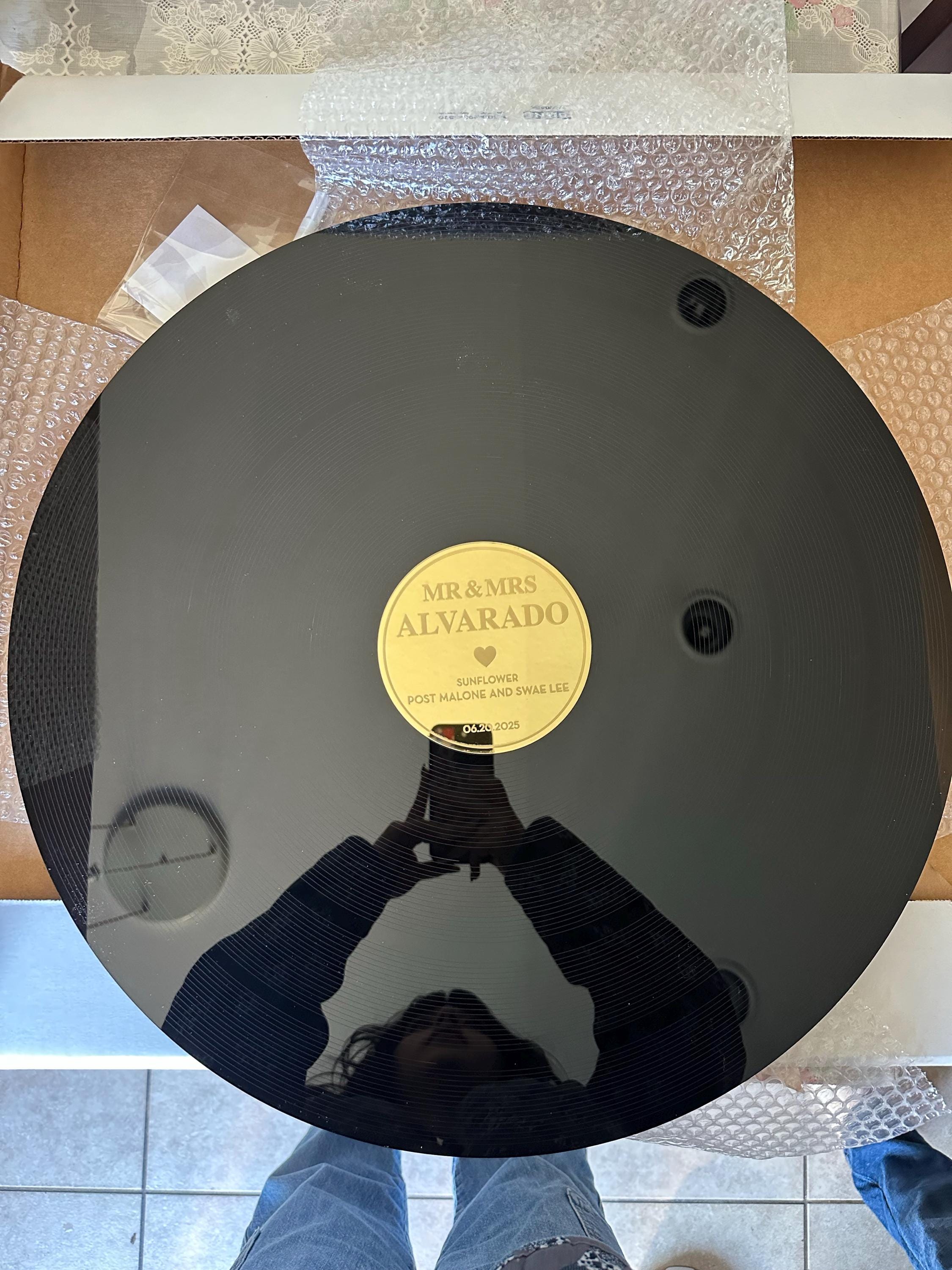 Personalized Centerpiece: Choose from 3 beautiful designs for the centerpiece of the record, engraved with your last name, wedding date, and a meaningful song title.